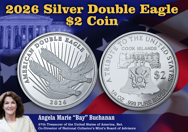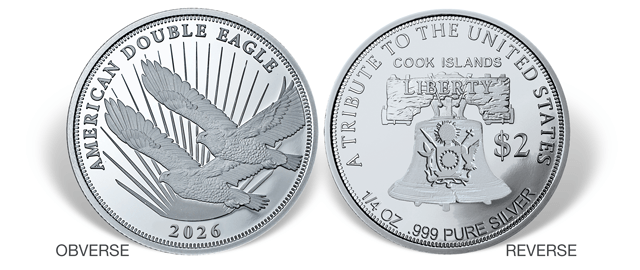 Meticulously struck as brilliant Silver Proofs, these Double Eagle $2 Coins are purer than any U.S. silver dollar ever to circulate! Each coin boasts two American Eagles in flight on the obverse, with the words “American Double Eagle”. The reverse features the frosted image of the Liberty Bell, the Cook Islands imprimatur, and the important $2 denomination on the reverse. Each is resplendent with highly prized frosted reliefs and mirror-like backgrounds, and the issue date of 2026.